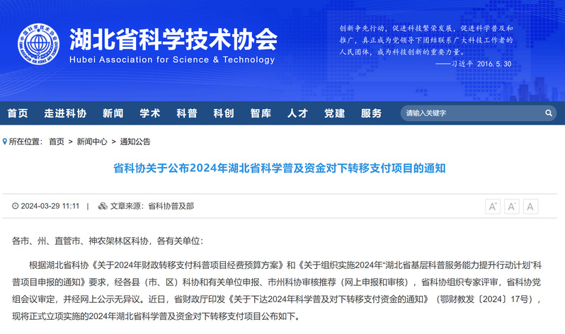 近日,湖北省科学技术协会发布关于2024年湖北省科学普及资金对下转移支付项目的通知。304am永利集团科技志愿服务队被评为湖北省优秀科技志愿服务队,获批省级经费支持。