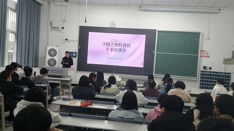 为夯实科普工作基础、提升干事综合素养,11 月 9 日下午,寻物之理科普社于科技大楼9101教室召开干事培训会。科普社会长邓雪,各部门部长及全体干事齐聚一堂。会议由干事张文杰主持。