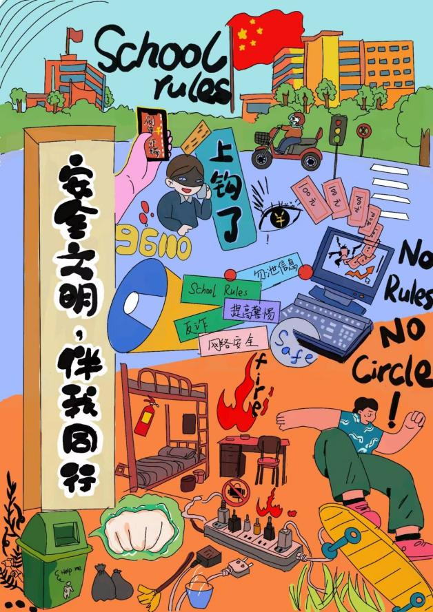 本次比赛以“安全文明伴我行”为主题,鼓励学生结合校园日常、交通安全、网络防护、文明交往等实际场景展开创作,题目自由拟定,充分给予学生发挥创意的空间。