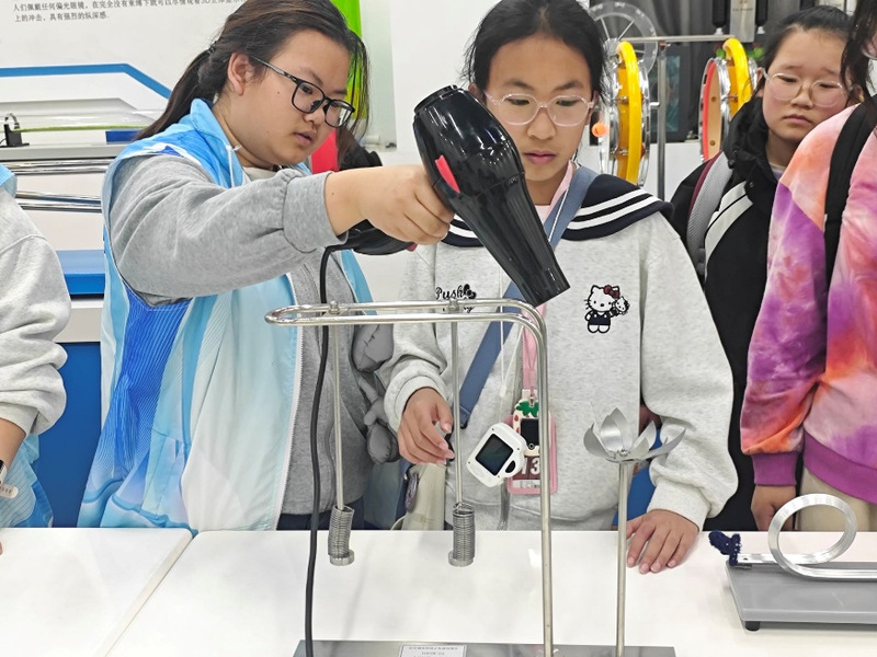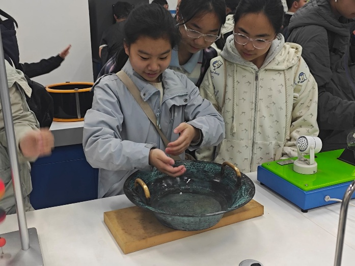 讲解结束后,互动体验环节将活动推向高潮。志愿者分组引导学生们动手操作展品,亲身验证科学原理。在鱼洗共振实验区,学生摩擦铜耳观察驻波;在手动发电模型前,学生旋转拉杆感受能量转化;在记忆合金装置旁,热风吹动下金属“开花”的景象,进一步加深学生对物理知识的理解。