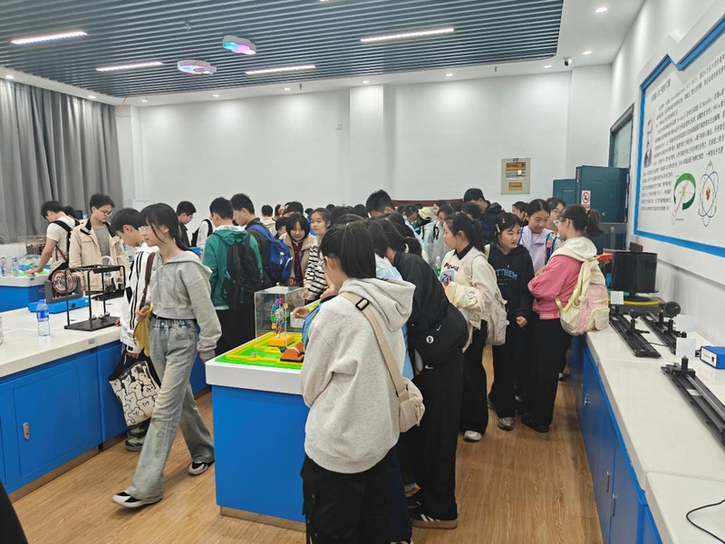 科普讲解环节随即展开。志愿者化身“科学讲解员”,围绕力学、光学、声学等领域,生动讲解单摆运动、共振现象、磁生电等原理。深入浅出的讲解将抽象知识转化为直观现象,吸引学生驻足倾听,激发其科学求知欲。