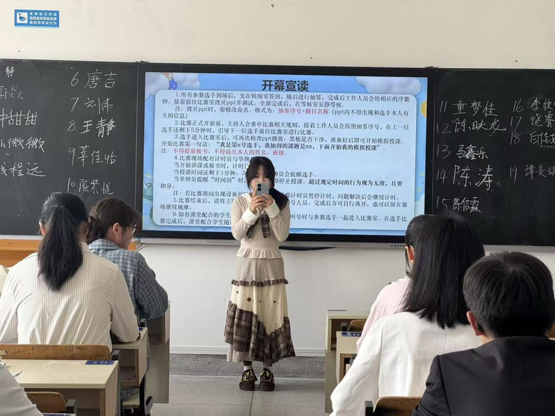 比赛以抽签确定参赛顺序与教学内容。选手们准备充分,教学设计科学合理,授课思路清晰严谨,PPT制作简洁精良,讲解仪态大方、表达自然流畅,充分展现了物电师范生扎实的专业功底与昂扬的青春风貌。