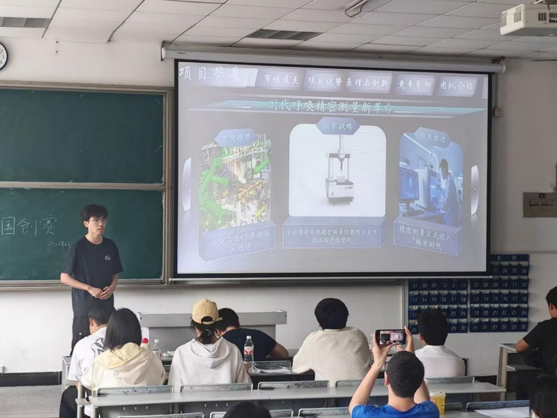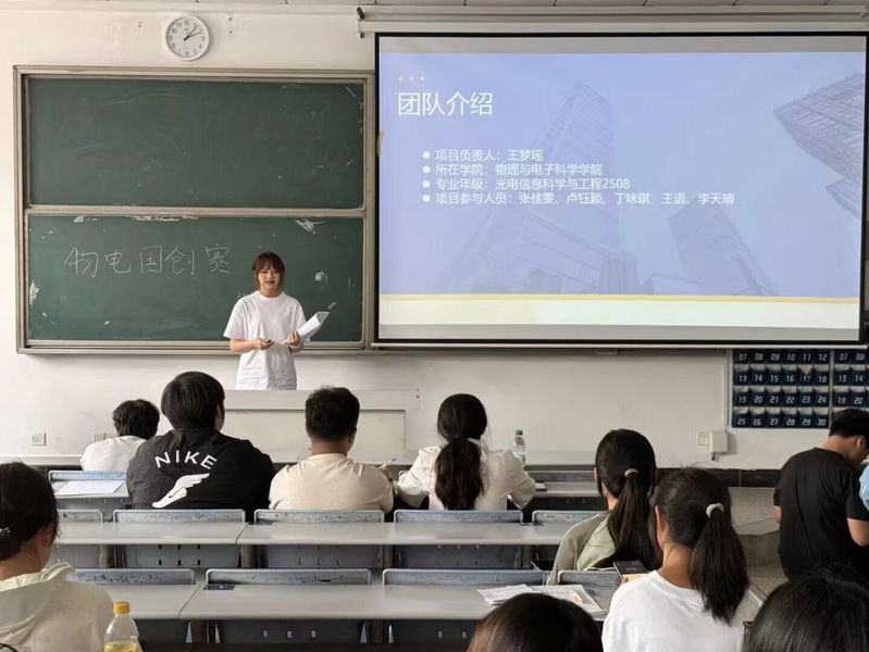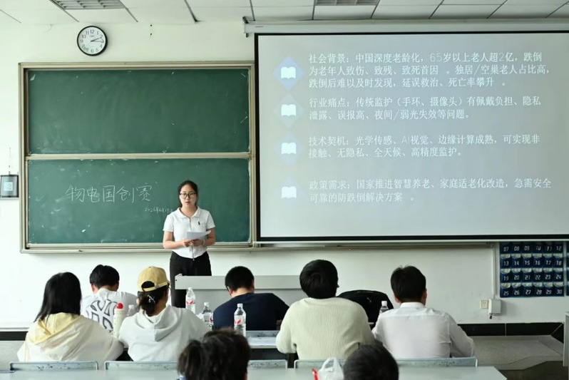 比赛现场,各参赛团队依次登台,借助PPT围绕项目研发背景、核心创新亮点、阶段性实践成果、市场应用价值及未来发展规划等方面进行全方位、立体化展示。参赛选手们精神风貌昂扬从容,语言表达条理清晰,充分彰显出物电学子过硬的专业素养、扎实的知识功底与锐意进取的创新精神。